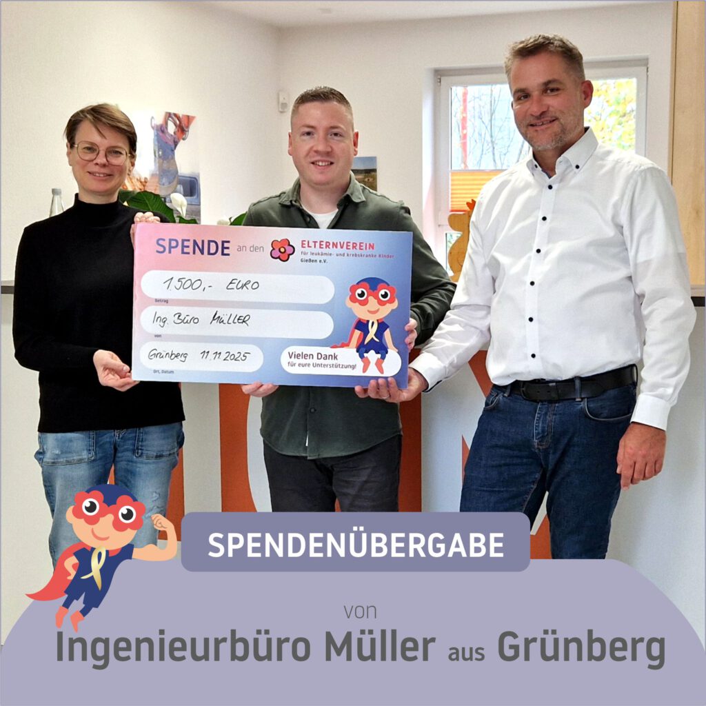 Das Ingenieurbüro Müller aus Grünberg hat unserem Elternverein eine großzügige Weihnachtsspende in Höhe von 1.500 Euro zukommen lassen, die Christina Müller-Jakesch und Marc Müller symbolisch an unseren Büroleiter Daniel Heller übergaben.